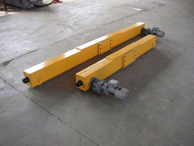 Dodáváme příčníky vlastní výroby o rozměrech dle rozpětí a nosnosti mostového jeřábu. Pojezdová kola jsou opatřena zapouzdřenými ložisky a hřídel převodovky je zasazena do osy kola. Pohonné jednotky se skládají z dvoustupňové převodovky s trvalou náplní a jednorychlostního motoru s brzdou, který má možnost ručního odbrždění, dodávané firmou KEB Antriebstechnik. V součinnosti s instalací frekvenčního měniče kmitočtu jsou nejvhodnějším a nejšetrnějším řešením pojezdu mostu.