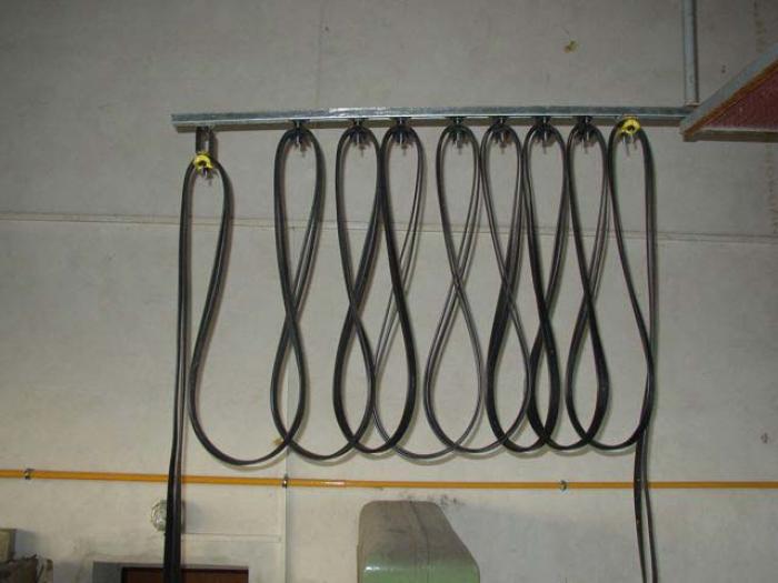 - shrnovací kabelové troleje tvořené C-profilem, vozíčky a plochými kabely pro napájení kladkostrojů i ovládacích panelů